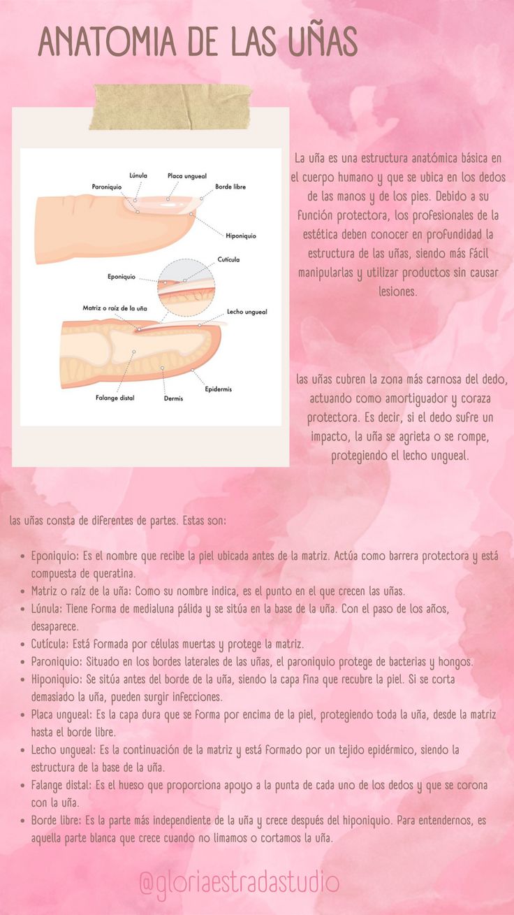 La uña está compuesta por varias capas y estructuras que desempeñan funciones específicas: